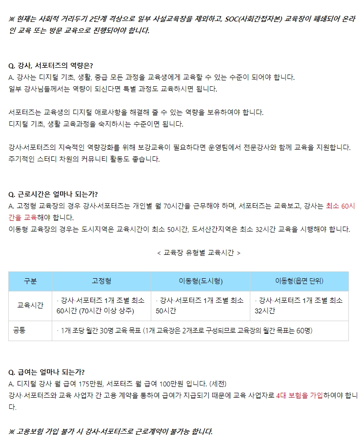 Q. 급여는 얼마나 되는가? A. 디지털 강사 월 급여 175만원, 서포터즈 월 급여 100만원 입니다. (세전) 강사 서포터즈와 교육 사업자 간 고용 계약을 통하여 급여가 지급되기 때문에 교육 사업자로 4대 보험을 가입하여야 협 다. 고용보험 가입 불가 시 강사 서포터즈로 근로계약이 불가능 합니다.