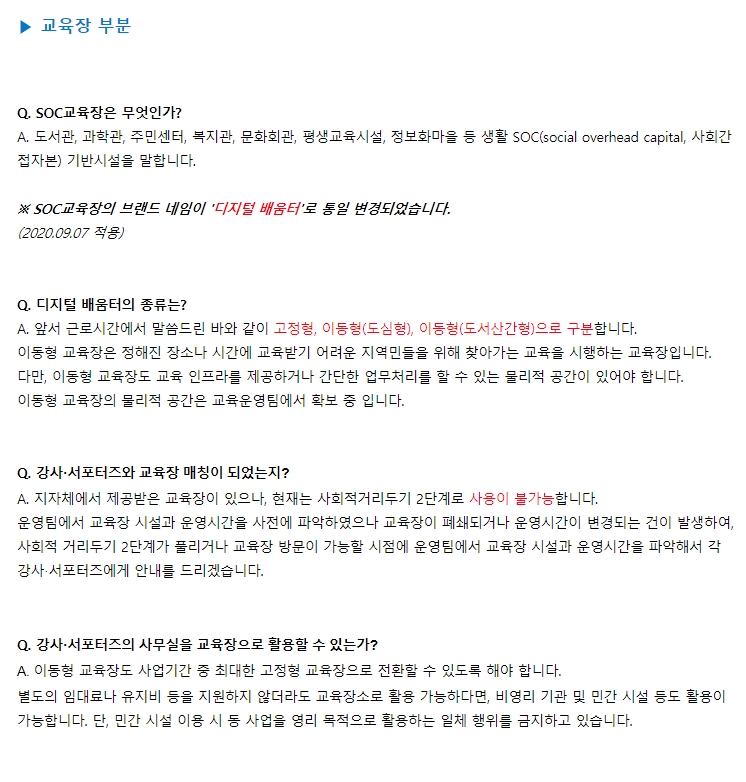 Q. 강사 · 서포터즈와 교육장 매칭이 되었는지? A. 지자체에서 제공받은 교국장이 있으나, 현재는 사회적거리두기 2단계로 사용이 불가능합니다. 운영팀에서 교육장 시설과 운영시간을 사전에 파악하였으나 교육장이 폐쇄되거나 운영시간이 변경되는 건이 발생하며, 사회적 거리두기 2단계가 풀리거나 교육장 방문이 가능할 시점에 운영팀에서 교육장 시설과 운영시간을 파악해서 각 강사 서포터즈에게 안내를 드리겠습니다.
