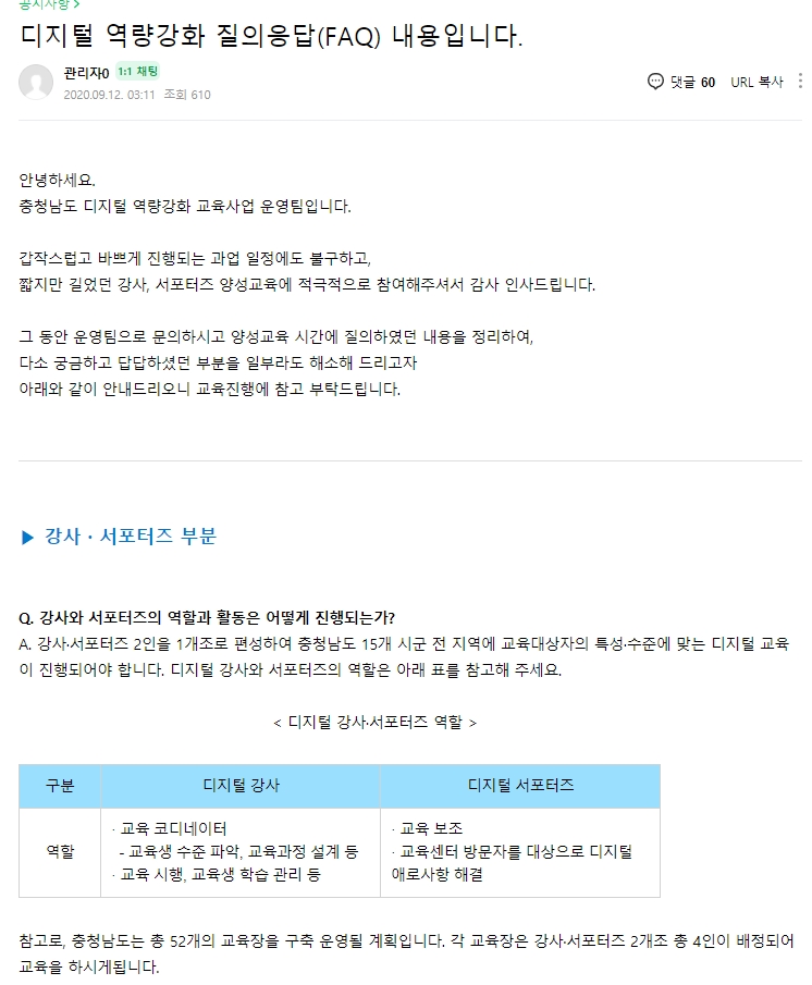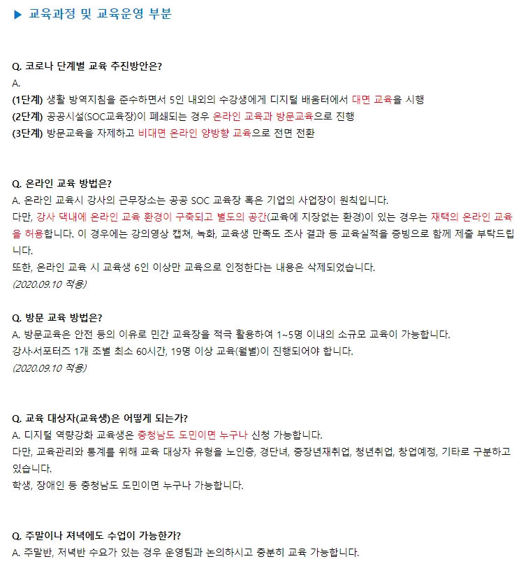 안녕하세요. 충청남도 디지털 역량강화 교육사업 운영팀입니다. 갑작스럽고 바쁘게 진행되는 과업 일정에도 불구하고, 짧지만 길었던 강사, 서포터즈 양성교육에 적극적으로 참여해주셔서 감사 인사드립니다. 그 동안 운영팀으로 문의하시고 양성교육 시간에 질의하였던 내용을 정리하여, 다소 궁금하고 답답하셨던 부분을 일부라도 해소해 드리고자 아래와 같이 안내드리오니 교육진행에 참고 부탁드립니다.