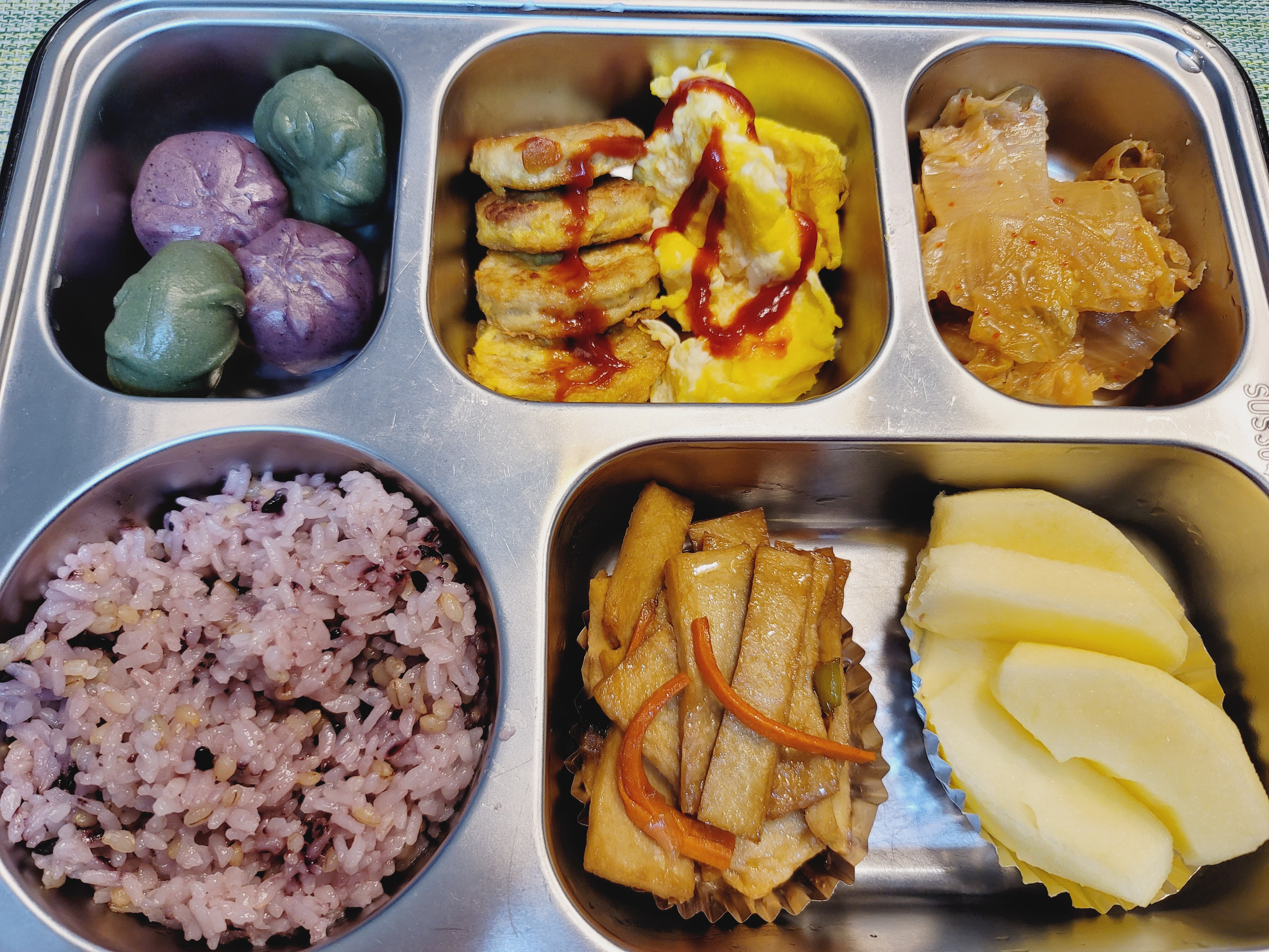 잡곡밥, 된장국에 도시락 반찬은 오뎅볶음, 동그랑땡, 계란부침, 볶음김치, 아리울 꿀떡, 사과입니다.