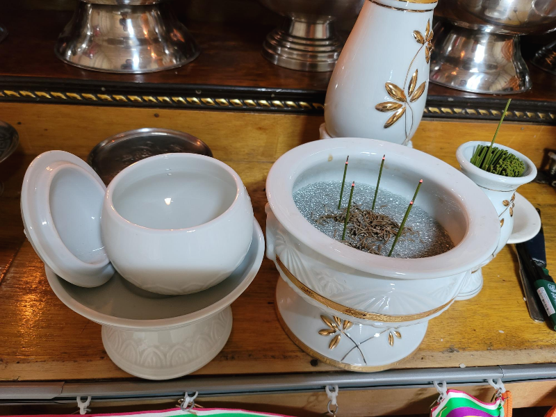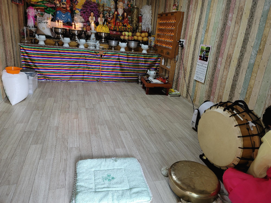 그러면 저는 신당에 올려진 옥수(물)을 옆에 놓여진 주전자에 다 따라붓고 밖에 샘(수도)으로 나갑니다. 주전자의 물(옥수)을 버리고 새로 물을 담아 가지고 신당으로 들어가서 그릇에 물을 따르고 향을 피웁니다.