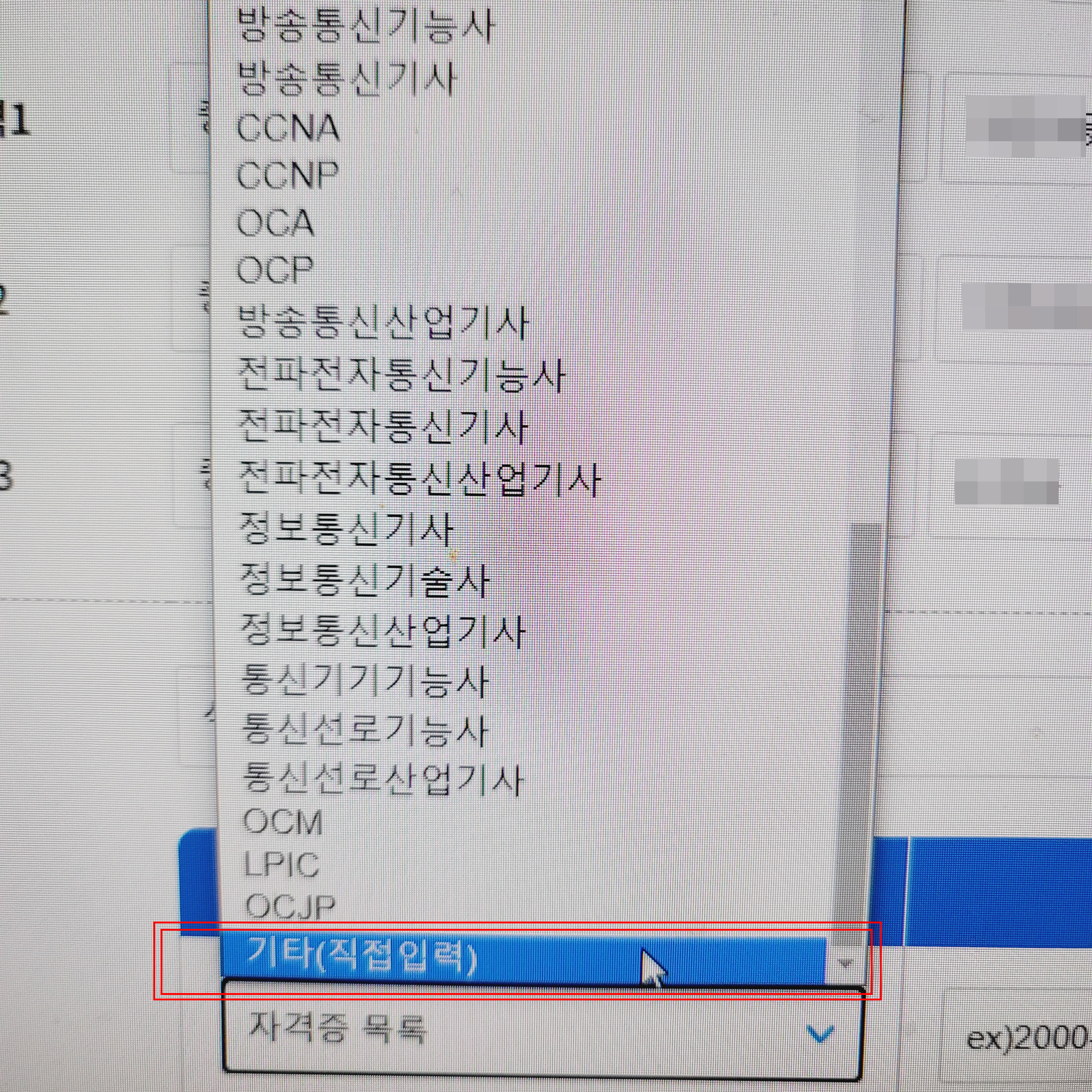 민간자격증을 가지고 계신 분들은 자격증을 적을 때 옆 바를 끌어 내려 맨 밑으로 가시면 기타(직접입력) 난이 있습니다.