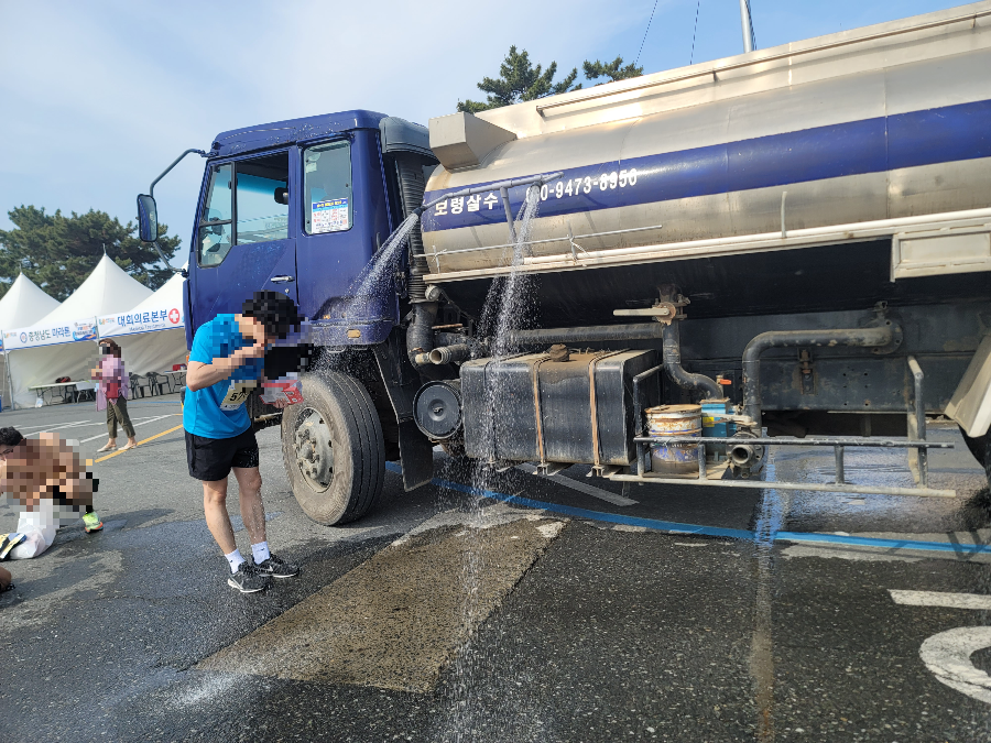 보령임해마라톤대회를 완주한후 커다란 트럭 살수차에서 시원한 물로 세수를 할 수 있습니다.